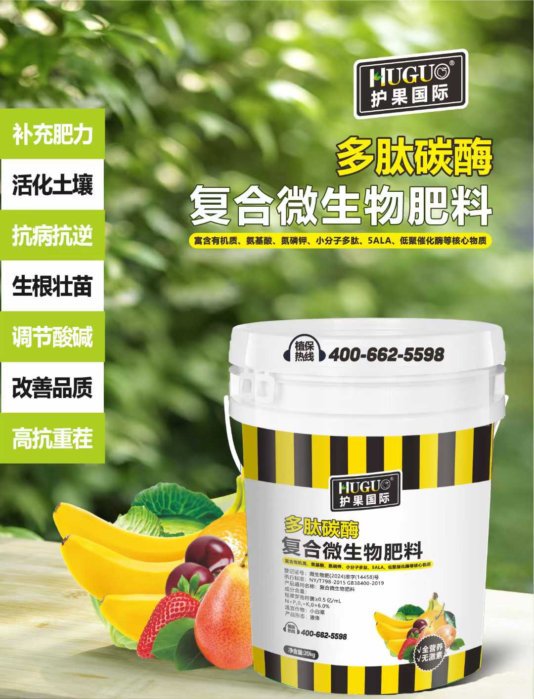 本品是纯绿色高科技新产品, 另添加氮、钾、中微量元素、动物蛋白、黄腐酸钾、氨基酸、保水剂、酵母素、钙、硅、碳等,高抗重茬,深度疏松土壤,促生根、防板结、治盐害,保水保肥、着色增糖,是目前国内首选生物刺激素特种肥